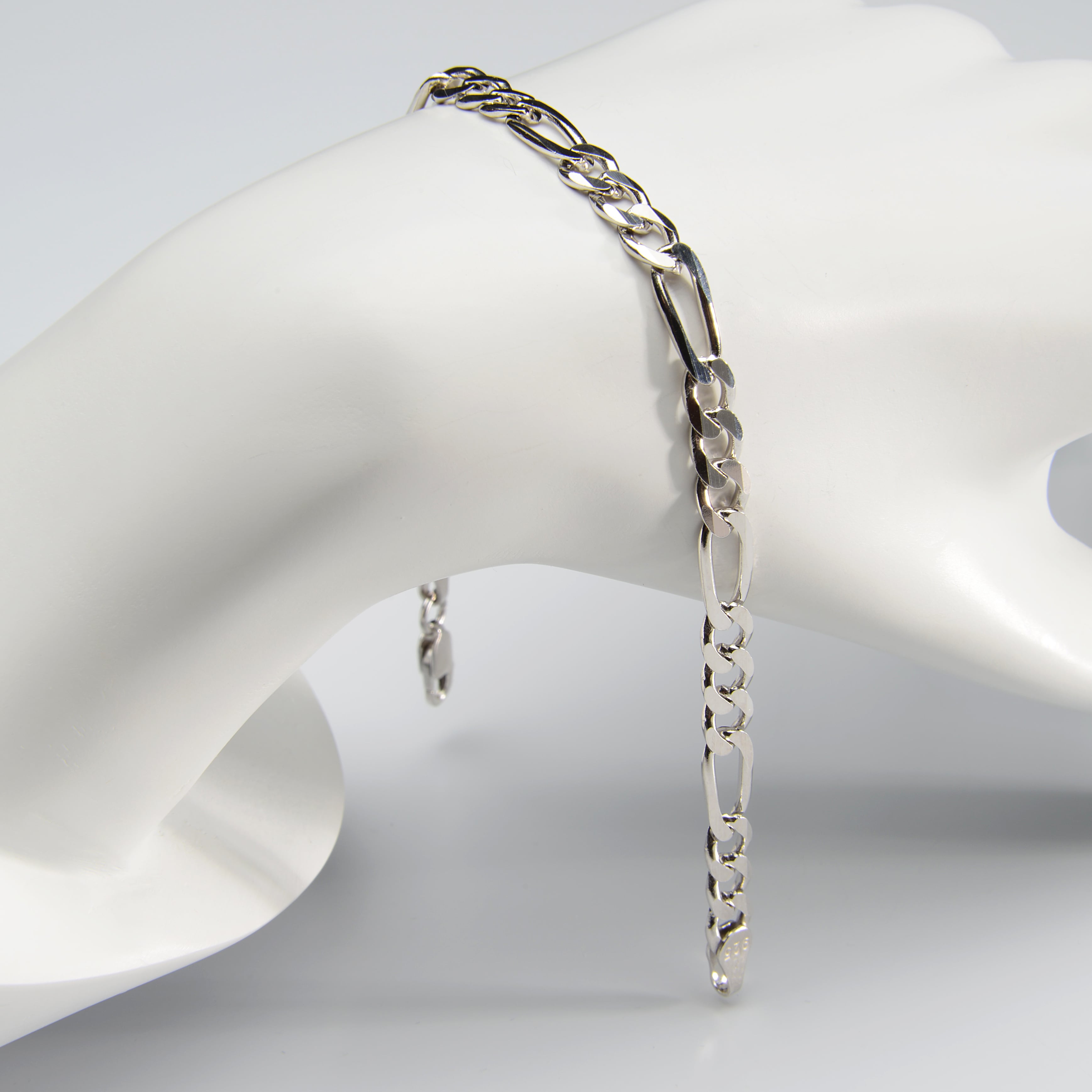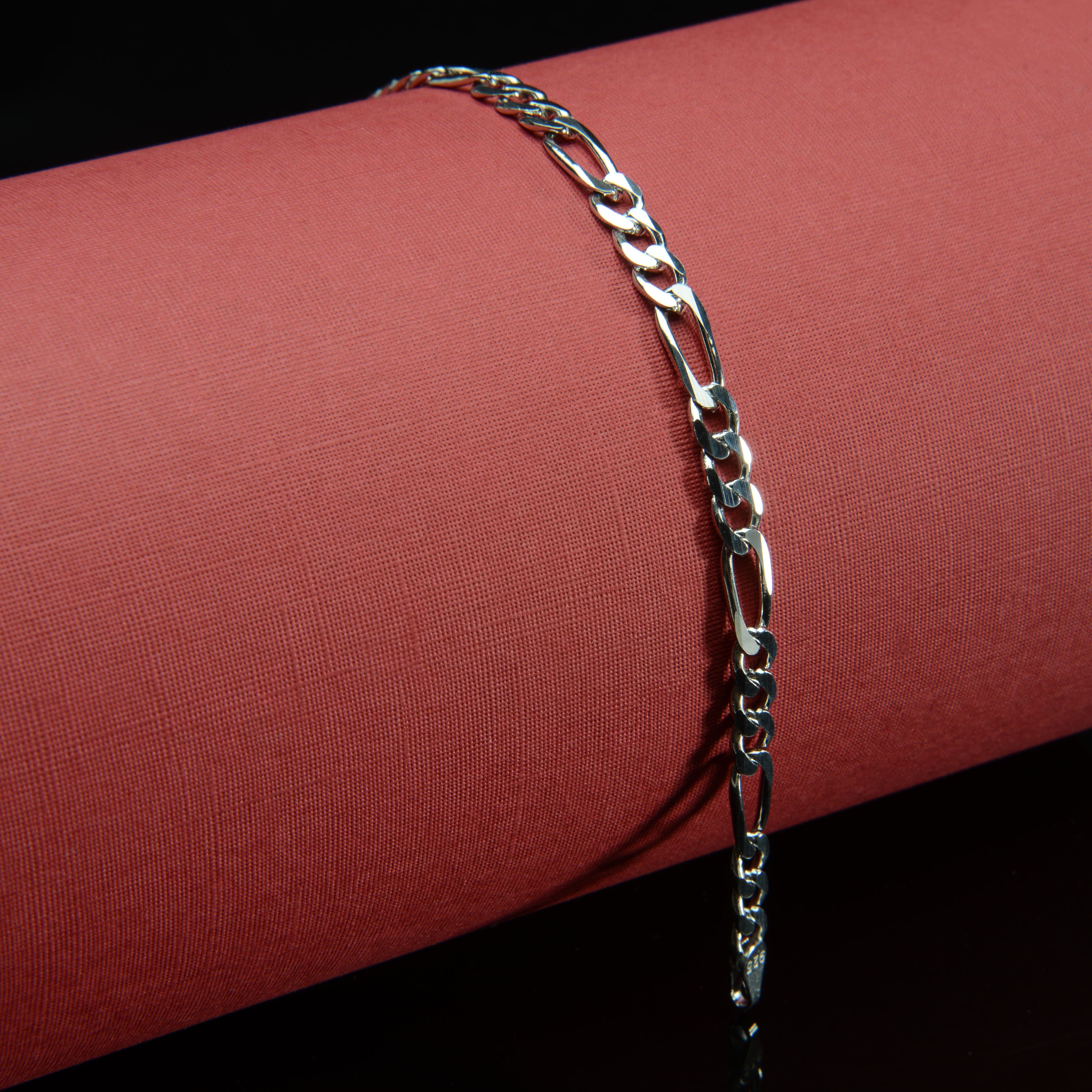 Silvalli Gümüş kalitesiyle, kararmayı yavaşlatan rodyum kaplama ile güçlendirilmiş 925 Ayar Gümüş Figaro zincirinden oluşan 150 Mikron Rodyum Figaro Gümüş Bileklik, hem Kadın Gümüş Bileklik hem de Erkek Gümüş Bileklik olarak zamansız bir şıklık sunar.